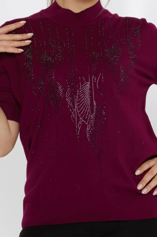 سترة محبوكة منقوشة بأحجار مطرزة باللون الأرجواني - 30663 | كازي (مجموعة من 3 مقاسات XL-2XL-3XL)