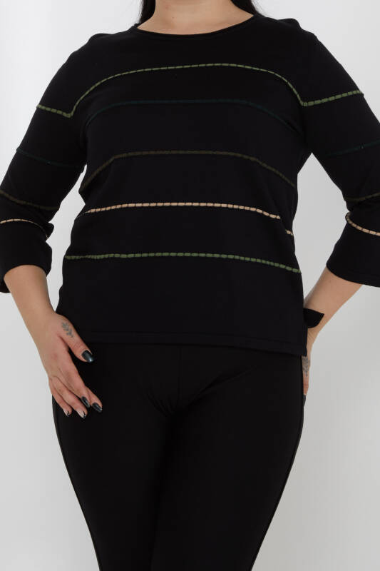 سترة محبوكة مخططة مطرزة بفتحة رقبة دائرية باللون الأسود-الكاكي - 31392 | كازي (مجموعة من 3 مقاسات M-L-XL)