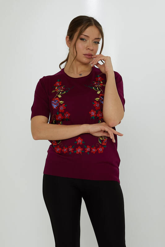 سترة محبوكة مطرزة بالزهور والأحجار باللون الأرجواني - 31728 | كازي (مجموعة من 3 مقاسات L-XL-2XL)