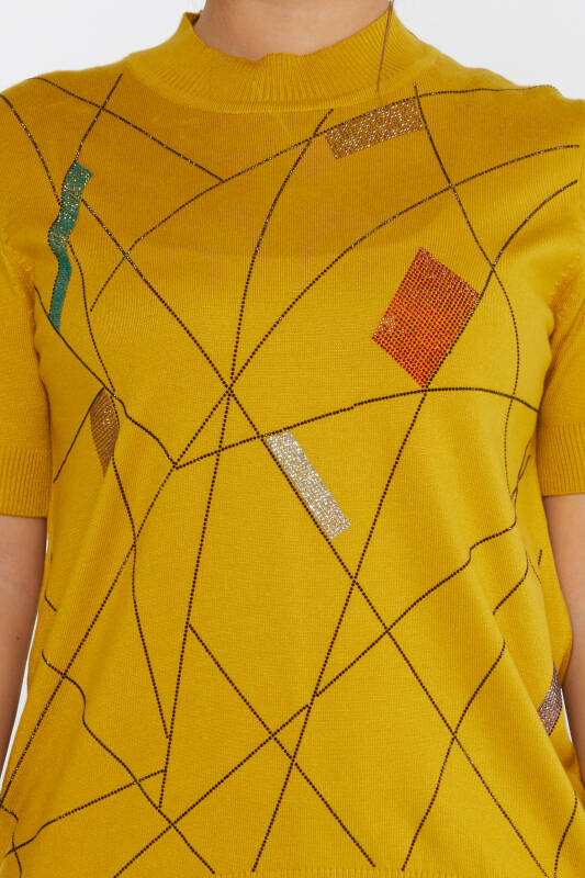 سترة تريكو ملونة مطرزة بالحجر كم قصير زعفراني - 30078 | كازي (مجموعة من 4 L-XL-2XL-3XL)