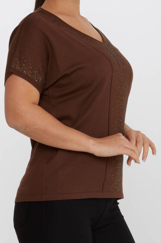 سترة تريكو مطرزة بالحجر كم قصير بني - 30761 | كازي (مجموعة من 4 L-XL-2XL-3XL)