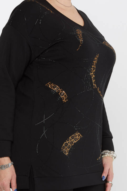 Sweatshirt mit farbigen Steinen und Leopardenmuster-Stickerei, Schwarz – 80099 | KAZEE (3er-Set L-XL-2XL)