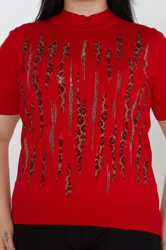 Sweter dzianinowy z motywem panterki i haftowanym stójką w kolorze czerwonym - 31565 | KAZEE (zestaw 3 sztuk M-L-XL)