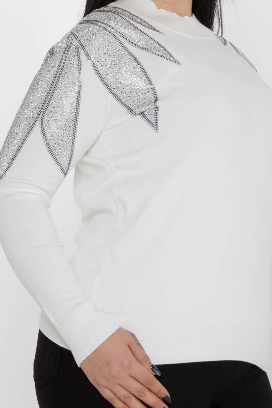 Sweter dzianinowy z haftowanym kamieniem na ramionach i stójką w kolorze ecru - 31601 | KAZEE (zestaw 3 sztuk M-L-XL)