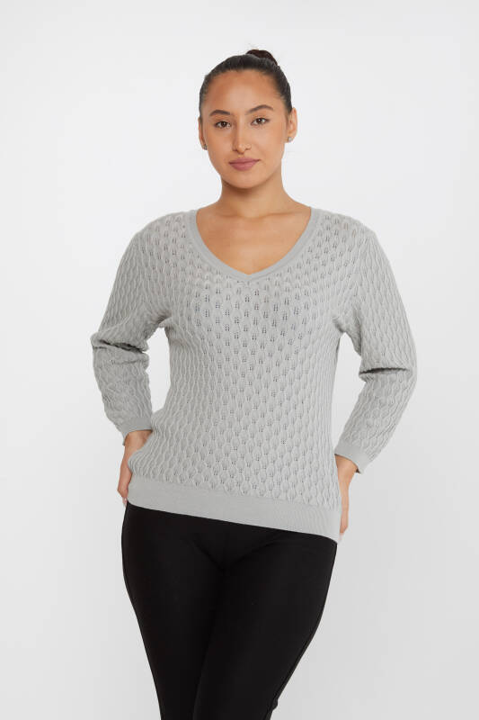 Sweter z dzianiny z własnym wzorem i dekoltem w serek, szary - 31247 | KAZEE (zestaw 3 sztuk M-L-XL)