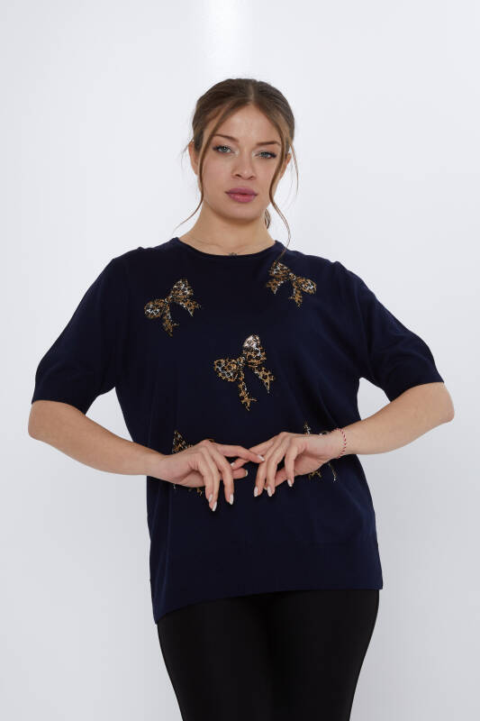 Sweter z dzianiny z kokardą i haftem, krótki rękaw, granatowy - 31577 | KAZEE (Zestaw 3 sztuk XL-2XL-3XL)