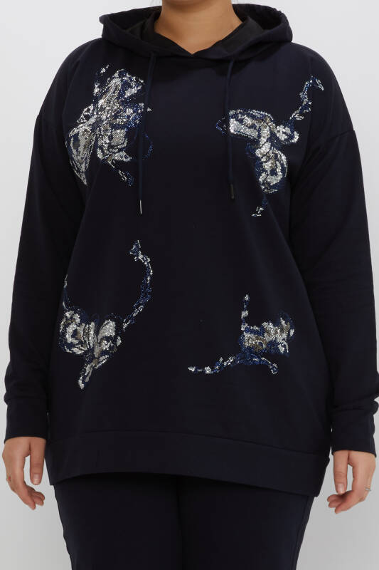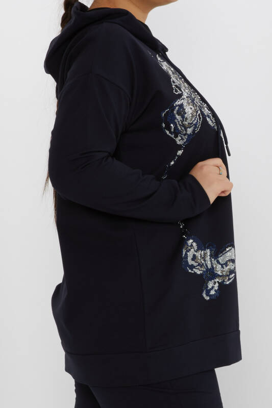 طقم رياضي بغطاء رأس ومطرز بالأحجار باللون الأزرق الداكن - 17897 | كازي (مجموعة من 3 مقاسات M-L-XL)