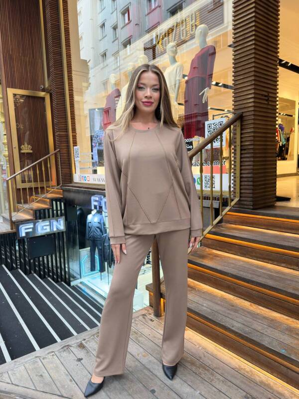 طقم رياضي بيج مزين بأحجار وجيوب - 17761 | كازي (طقم من 3 قطع، مقاسات M-L-XL)