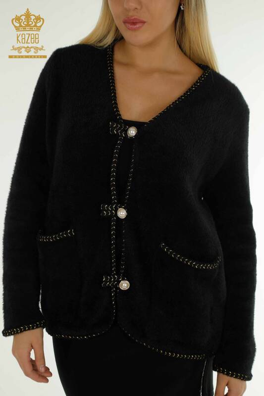 Toptan Kadın Angora Hırka İnci Düğmeli Cep Detaylı Siyah - 30264 | KAZEE