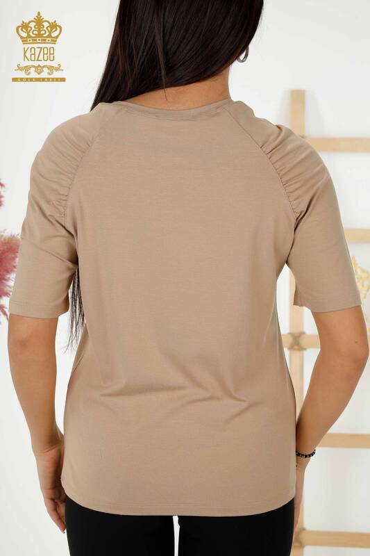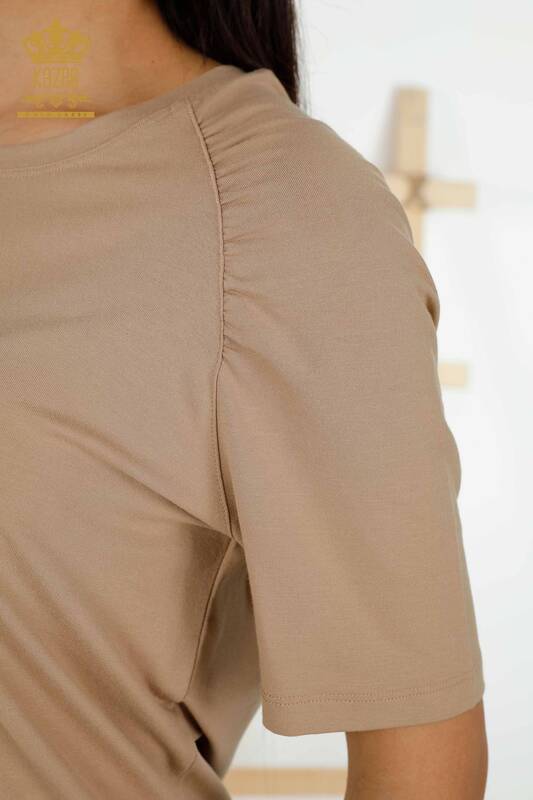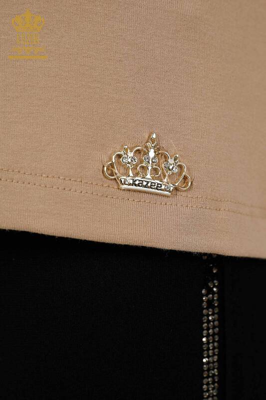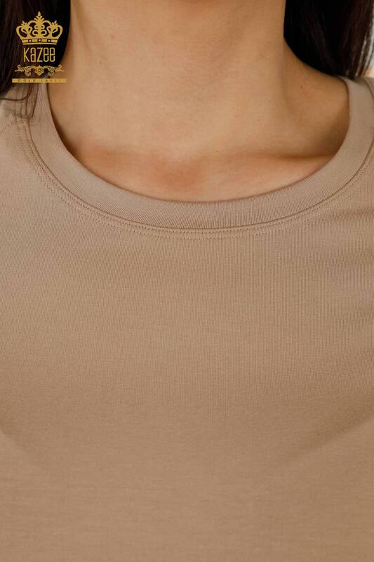 Toptan Kadın Bluz Basic Kısa Kol Logolu Bej - 79219 | KAZEE