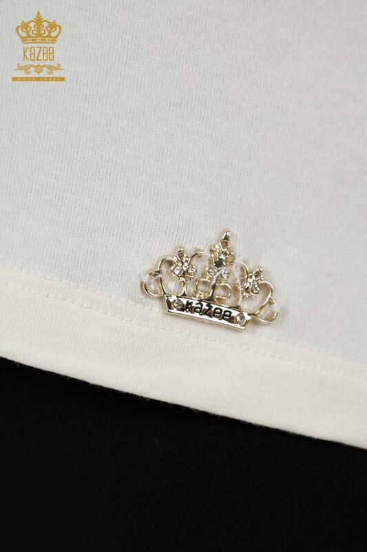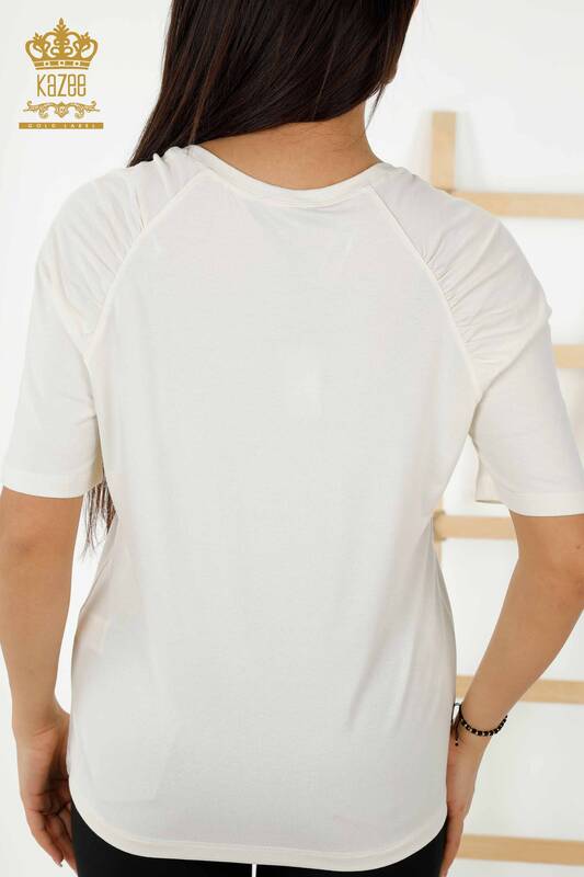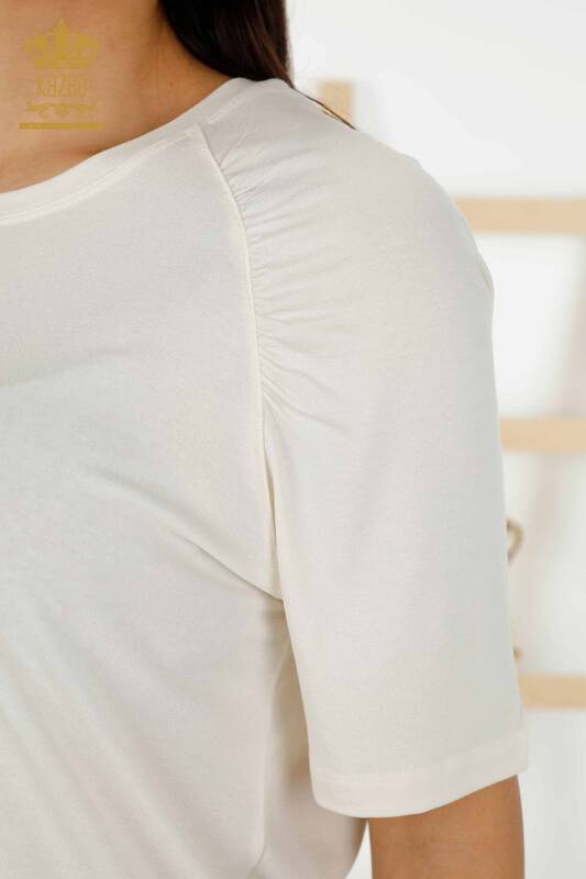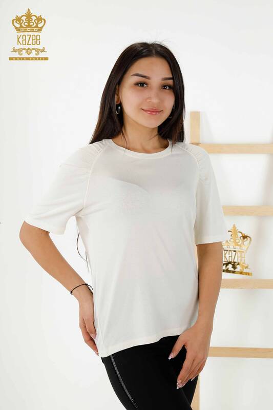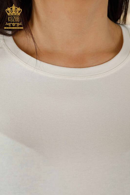Toptan Kadın Bluz Basic Kısa Kol Logolu Ekru - 79219 | KAZEE