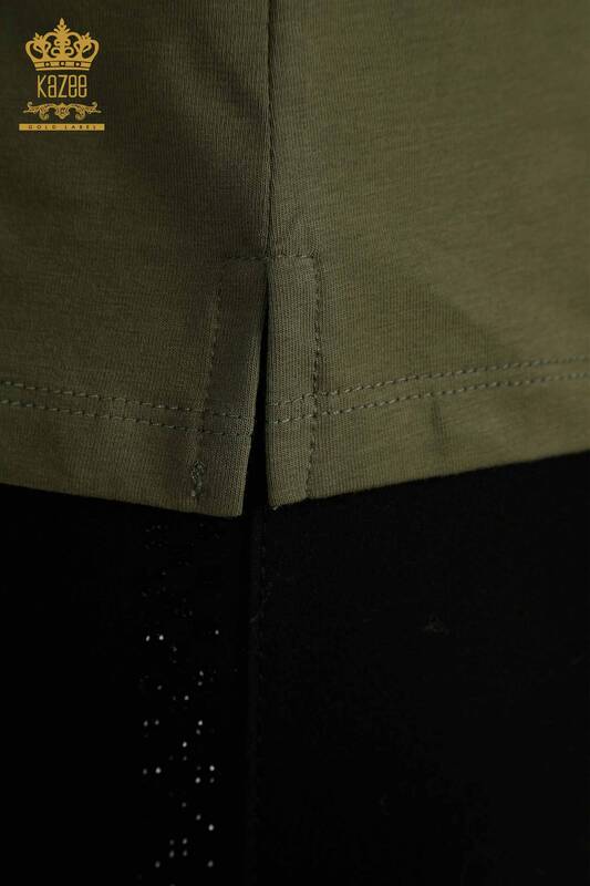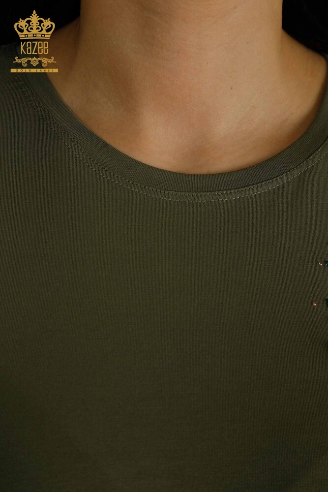 Оптовая женская блузка с карманом и цветочным узором, вышитая камнем цвета хаки - 79477 | КАЗИ