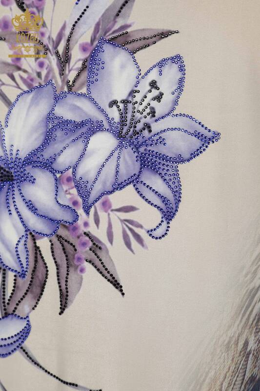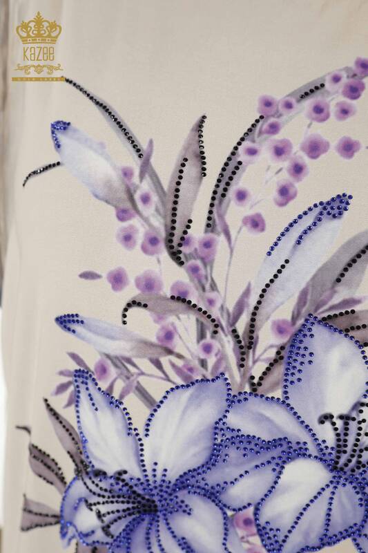 Toptan Kadın Bluz Çiçek Desenli Taş İşlemeli Kısa Kol Bej - 77769 | KAZEE
