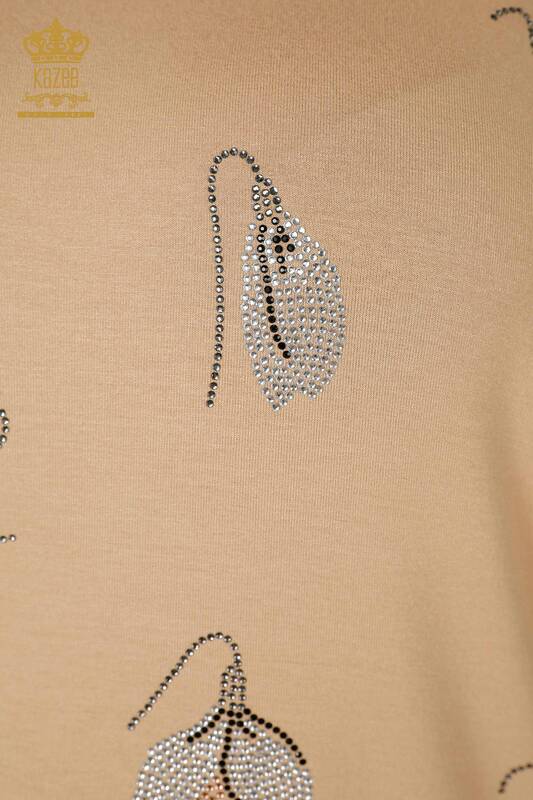 Toptan Kadın Bluz Amerikan Model Çiçek Desenli Taş İşlemeli Bej - 78934 | KAZEE