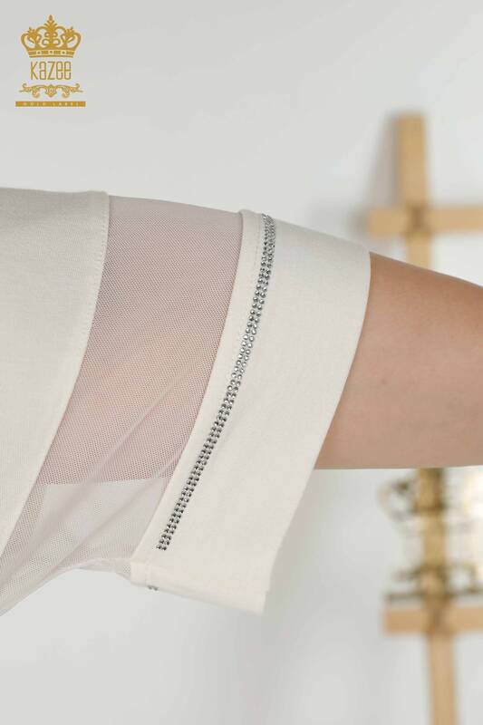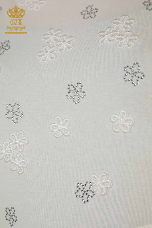 Toptan Kadın Bluz Kısa Kol Taş İşlemeli Çiçek Desenli Ekru - 79100 | KAZEE