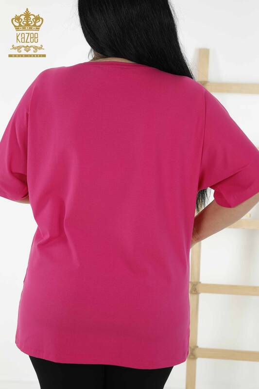 Toptan Kadın Bluz Çiçek Desenli Taş İşlemeli Fuşya - 79089 | KAZEE