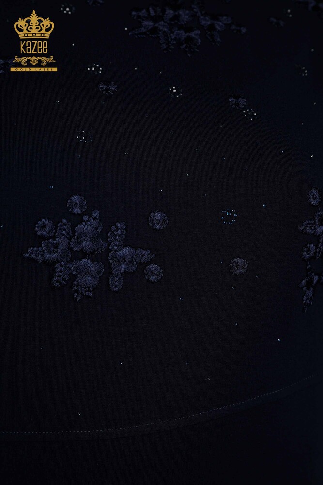 Großhandel Damenbluse Kurzarm Steinbesticktes Blumenmuster Marineblau - 79087 | KAZEE