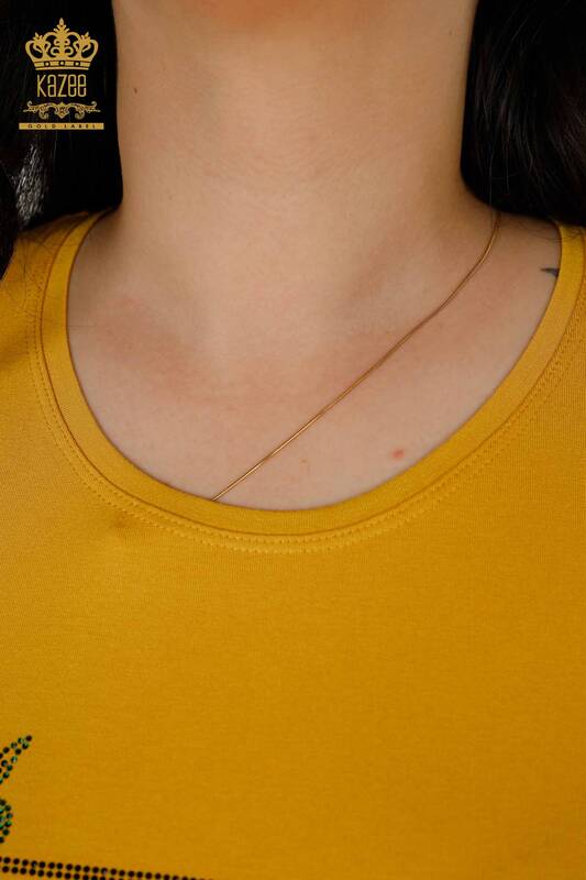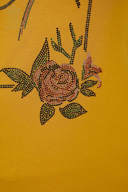 Toptan Kadın Bluz Çiçek Desenli Taş İşlemeli Safran - 79042 | KAZEE