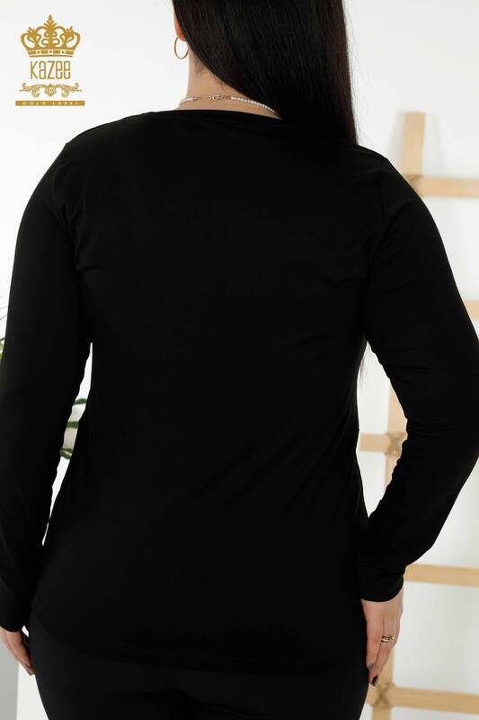Toptan Kadın Bluz Çiçek Desenli Taş İşlemeli Siyah - 79045 | KAZEE