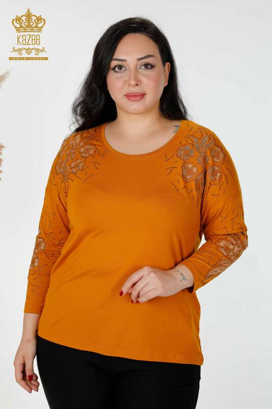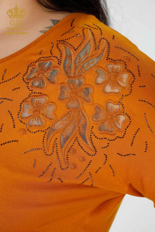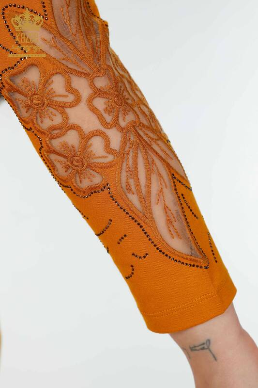 Toptan Kadın Bluz Çiçek Desenli Tül Detaylı Taş İşlemeli Taba - 77950 | KAZEE