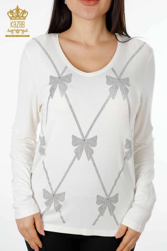 Toptan Kadın Triko Kazak Desenli Taş İşlemeli Bisiklet Yaka Ekru - 79003 | KAZEE