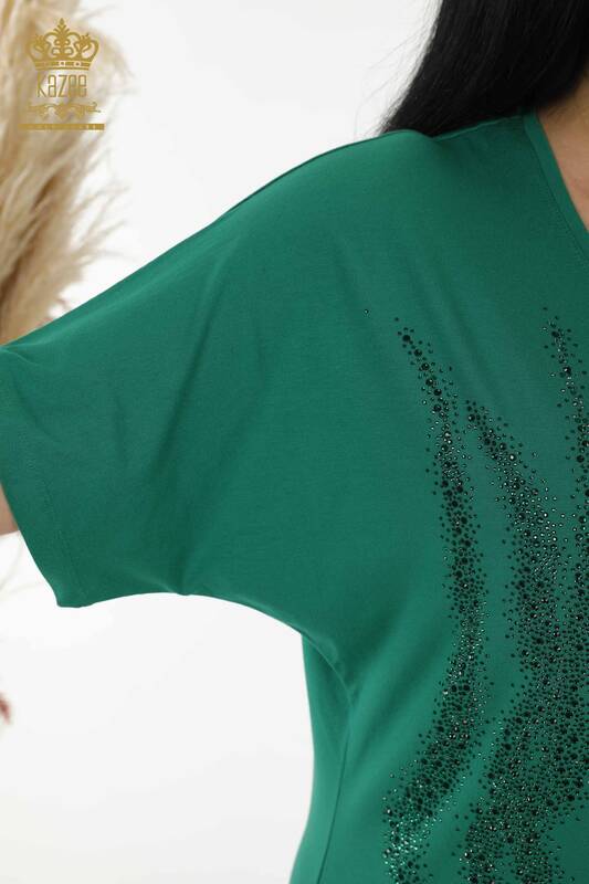 Toptan Kadın Bluz Desenli Kısa Kol Taş İşlemeli Yeşil - 79070 | KAZEE