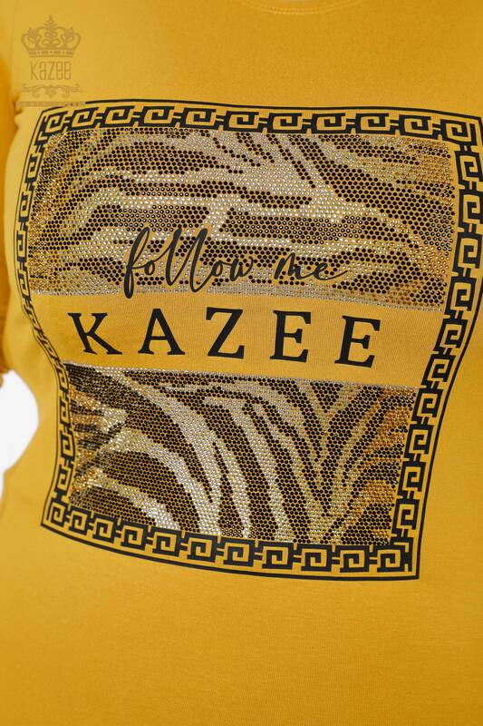 Venta al por mayor Blusa de Mujer Con Texto Detallado Cuello Redondo Bordado Piedra Azafrán - 78997 | kazee