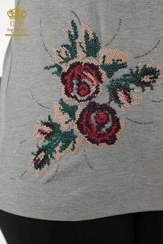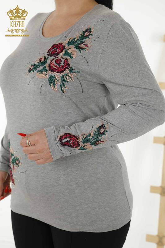 Toptan Kadın Bluz Gül Desenli Taş İşlemeli Gri - 79046 | KAZEE
