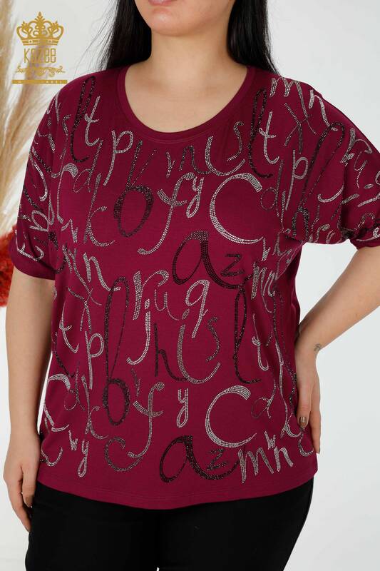 Toptan Kadın Bluz Kristal Taş İşlemeli Harf Detaylı Eflatun - 78833 | KAZEE