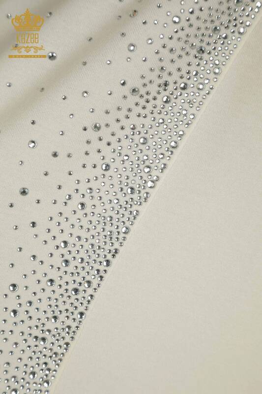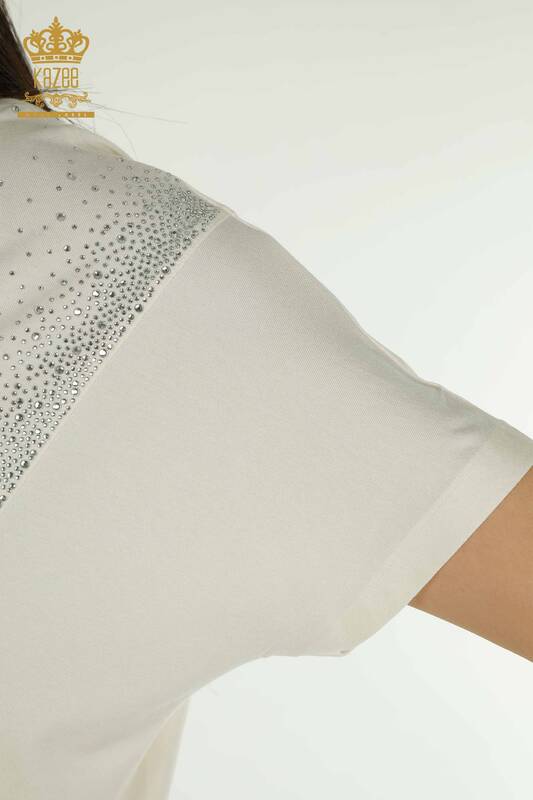 Toptan Kadın Bluz İki Cepli Kısa Kol Taş İşlemeli Ekru - 79293 | KAZEE