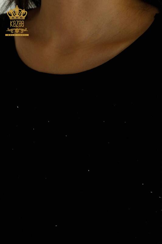 Toptan Kadın Bluz İki Cepli Kısa Kol Taş İşlemeli Siyah - 79293 | KAZEE