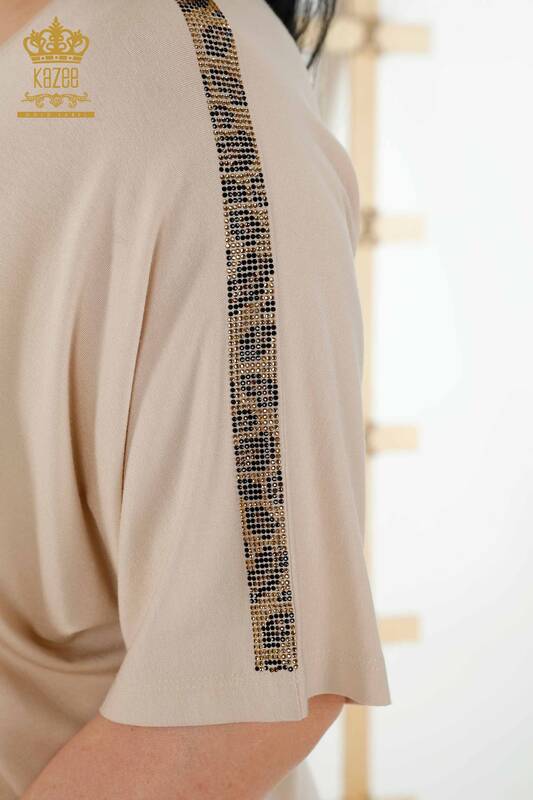 Toptan Kadın Bluz Kaplan Detaylı Taş İşlemeli Bej - 77683 | KAZEE