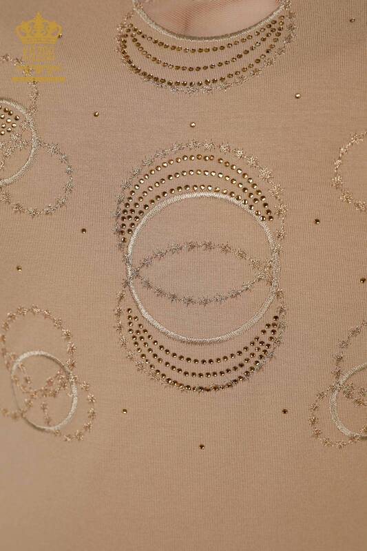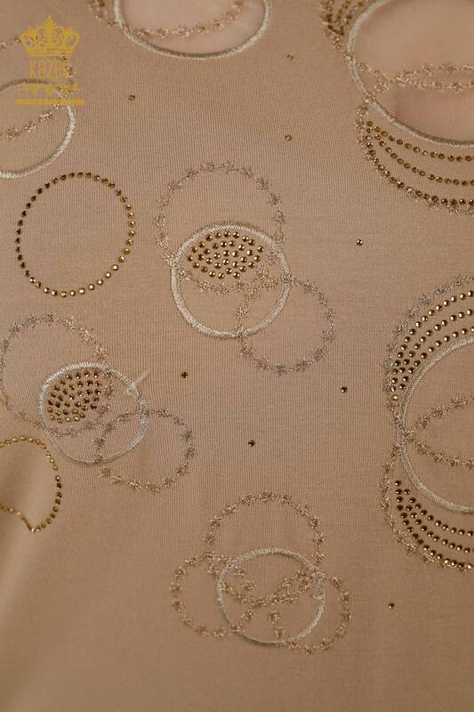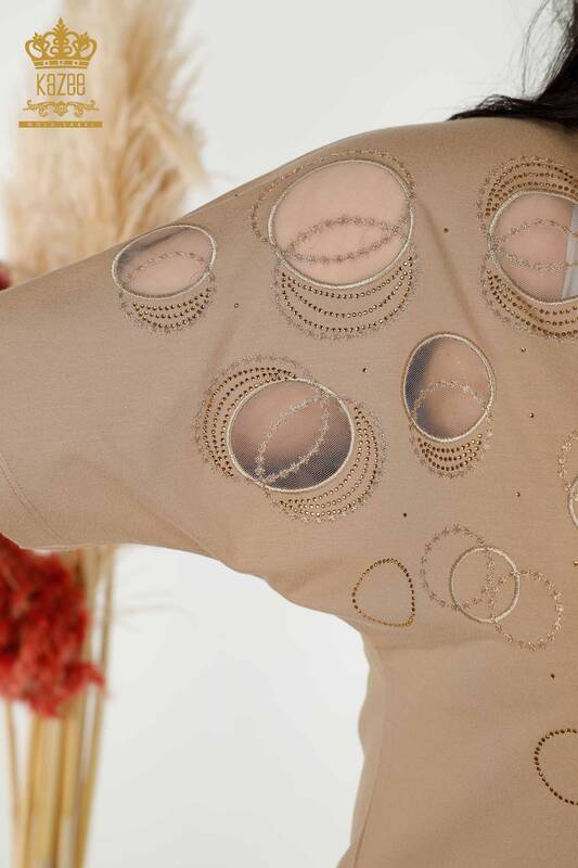Grossiste Chemisier Femme Manches Courtes Motif Pierre Brodé Tulle Détaillé Beige - 79094 | KAZEE