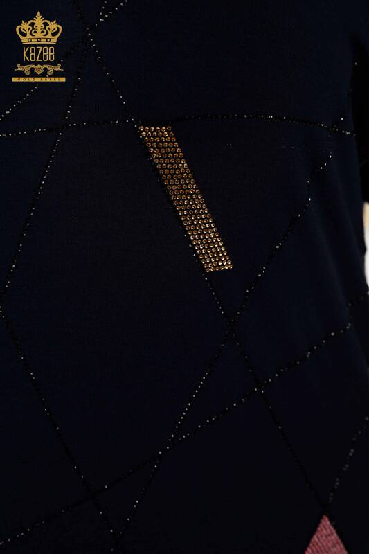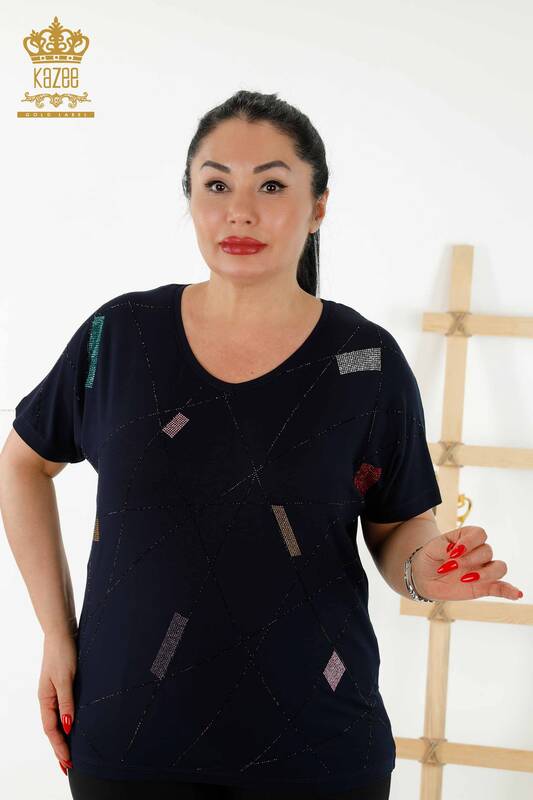 Toptan Kadın Bluz Taş İşlemeli Desenli Kısa Kol Lacivert - 79288 | KAZEE