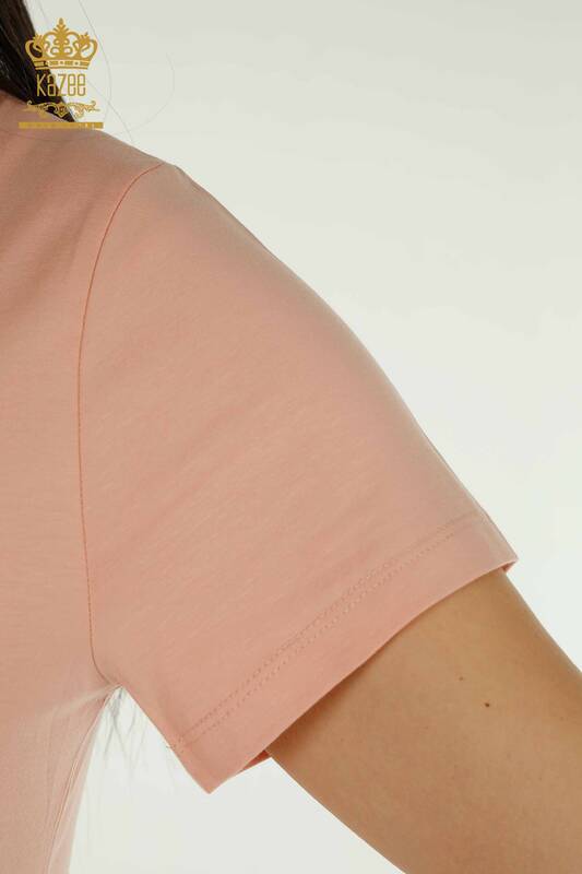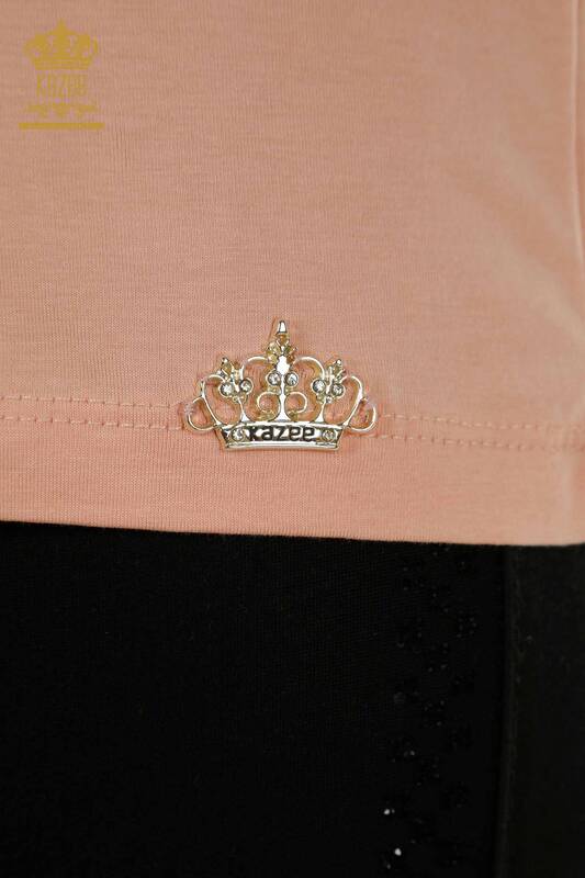 Toptan Kadın Bluz Basic Kısa Kol Logolu Pudra - 79178 | KAZEE