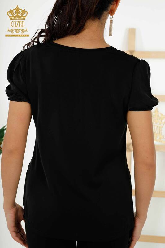 Toptan Kadın Bluz Taş İşlemeli Kısa Kol Bisiklet Yaka Siyah - 79226 | KAZEE