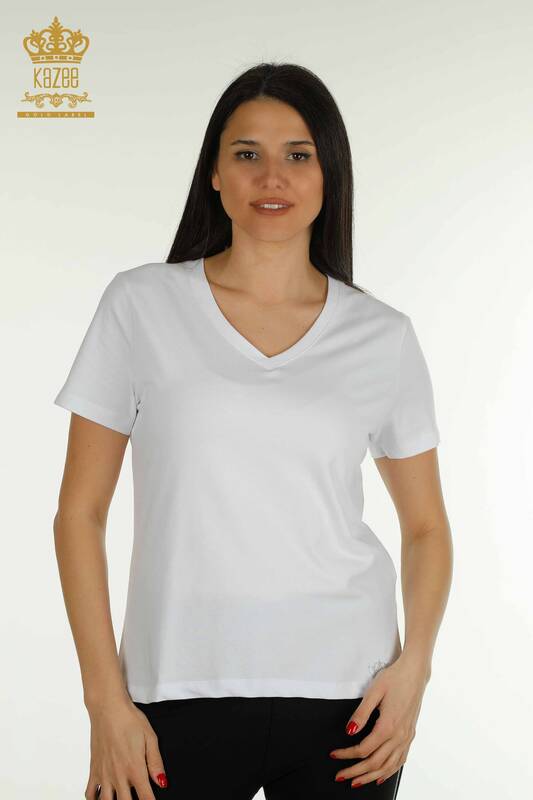 Venta al por mayor Blusa de Mujer Manga Corta Piedra Bordada Escote en V Blanco - 79561 | KAZEE