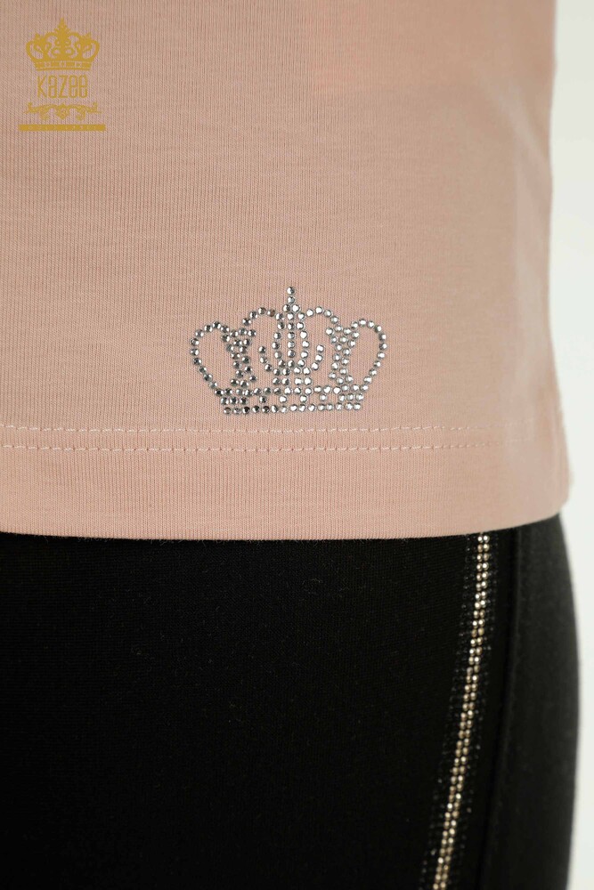 Chemisier Femme En Gros À Manches Courtes Pierre Brodée Col V Poudre - 79561 | KAZÉE