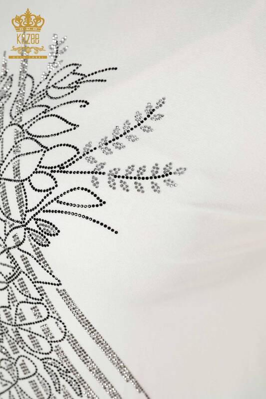 Toptan Kadın Bluz Kristal Taş İşlemeli Desenli Bisiklet Yaka Ekru - 78944| KAZEE