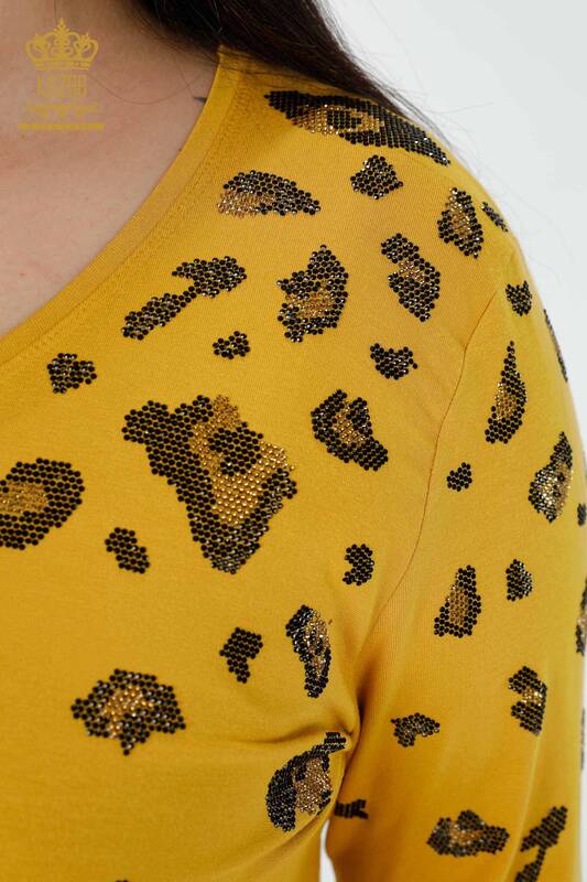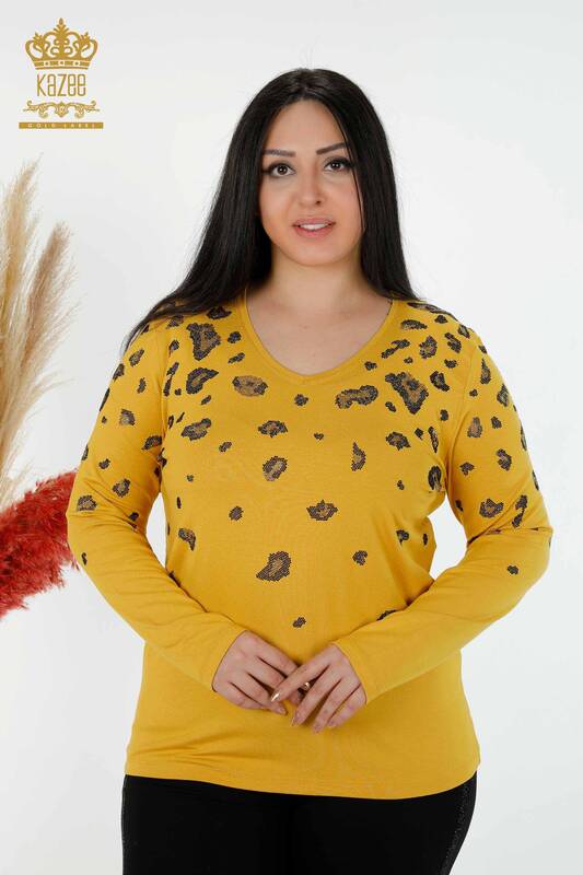 Hurtownia Damska Bluzka Panterka Kamień Haftowany Dekolt w Serek Szafran - 79047 | KAZEE