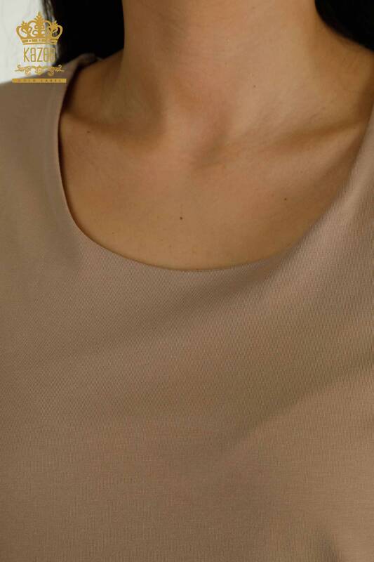 Hurtownia bluzek damskich z haftowanym kamieniem i logo Mink z krótkim rękawem - 79560 | KAZEE