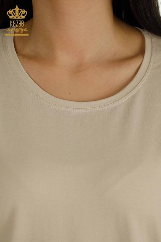 فروش عمده بلوز زنانه شانه توری سنگ دوزی شده آستین کوتاه بژ روشن - 79553 | KAZEE
