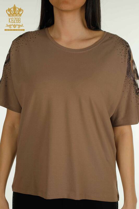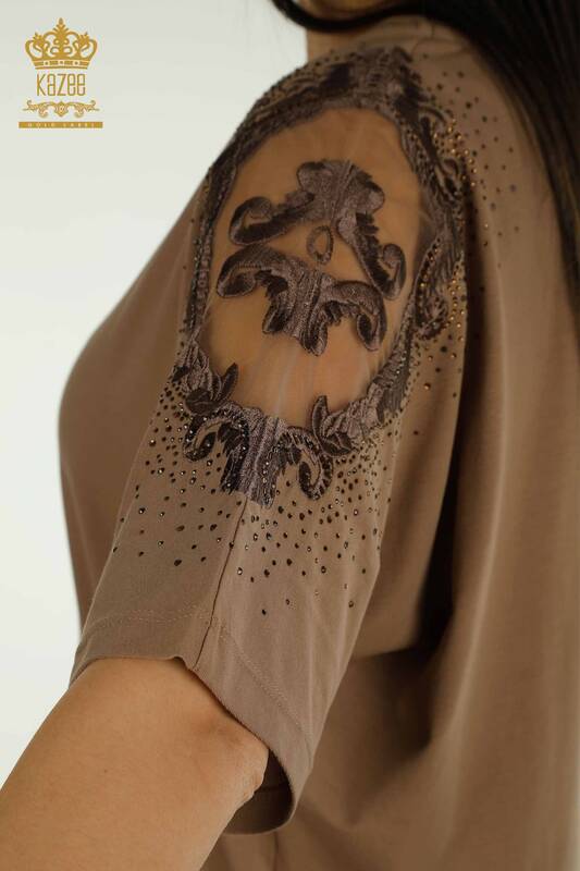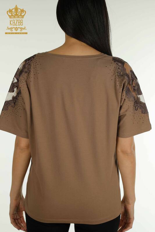 Toptan Kadın Bluz Omuz Tül Detaylı Taş İşlemeli Kısa Kol Kahve - 79553 | KAZEE