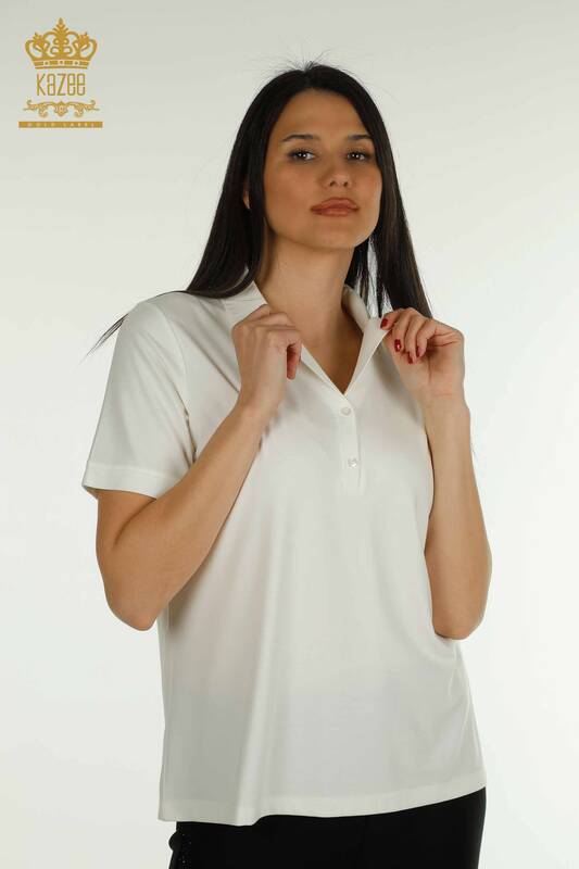 الجملة المرأة بلوزة بولو الرقبة زر مفصلة قصيرة الأكمام إكرو - 79503 | كازي