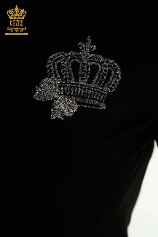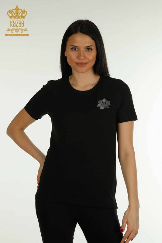 الجملة بلوزة نسائية مطرزة التاج كم قصير طاقم الرقبة أسود - 79476 | كازي