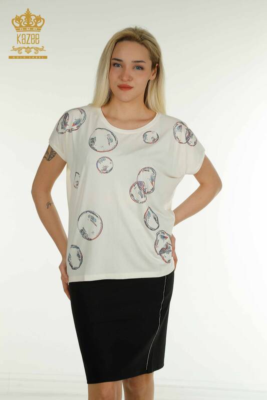 Toptan Kadın Bluz Taş İşlemeli Kısa Kollu Ekru - 79359 | KAZEE