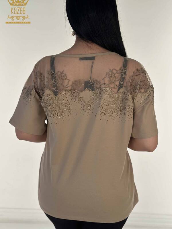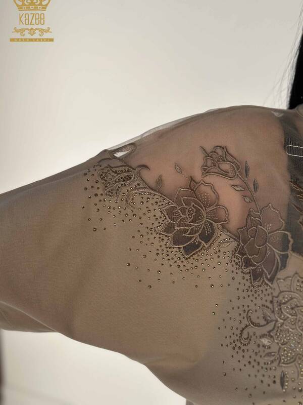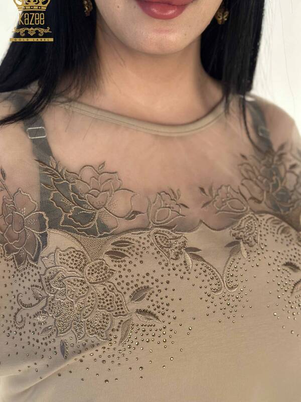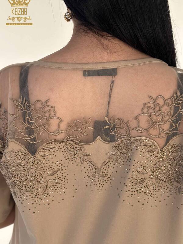 Toptan Kadın Bluz Tül Detaylı Çiçek Nakışlı Taş İşlemeli Bej - 79453 | KAZEE