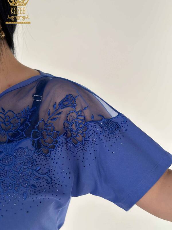 Toptan Kadın Bluz Tül Detaylı Çiçek Nakışlı Taş İşlemeli İndigo - 79453 | KAZEE