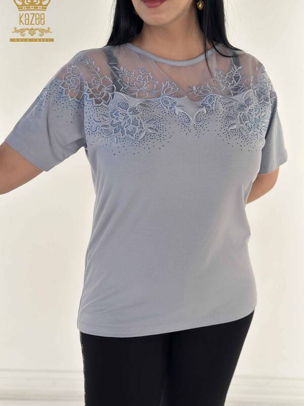 Toptan Kadın Bluz Tül Detaylı Çiçek Nakışlı Taş İşlemeli Mavi - 79453 | KAZEE