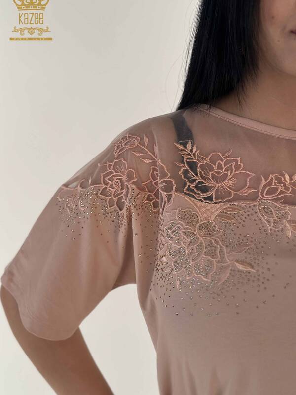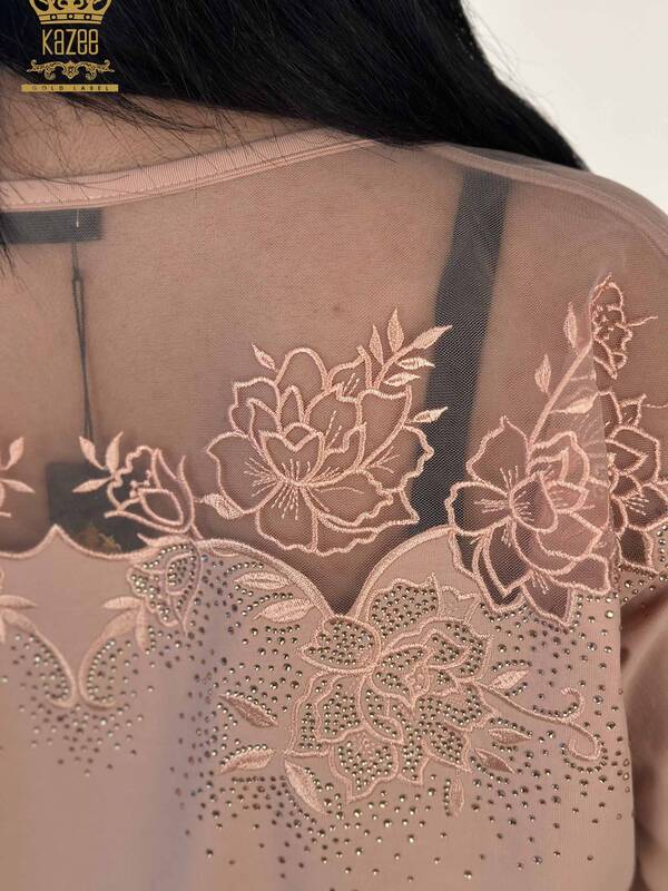 Toptan Kadın Bluz Tül Detaylı Çiçek Nakışlı Taş İşlemeli Pudra - 79453 | KAZEE